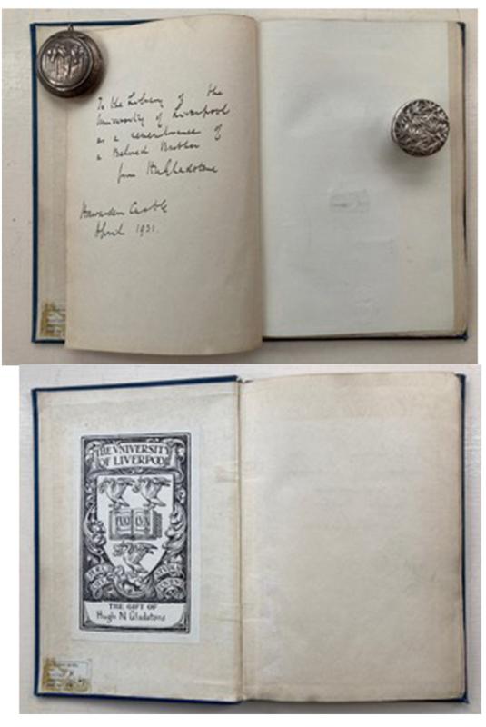 This copy was inscribed and presented on publication to the University of Liverpool by Hugh Neville Gladstone of Hawarden Castle the elder brother of the author (and son of the 4 times British Prime Minister William Ewart Gladstone)