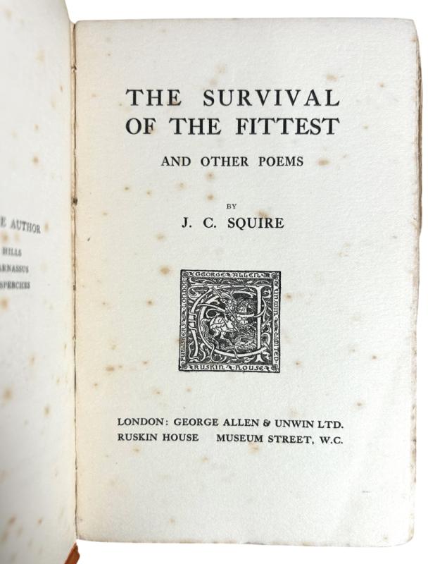 The titular poem, ‘The Survival of the Fittest’, begins with an epigram from the Star. It reads: ‘Those like Mr. Strachey, of The Spectator, who say that without war the race would degenerate’. Squire speaks back in the first stanza: ‘These were my friends; | Strachey, you did not know them, | For they were simple, unaspiring men’. A sympathetic work – intimate still with familial ownership. This is his best known collection.