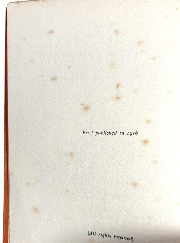 London: George Allen & Unwin Ltd., 1916. First edition, first printing. This is a very good (or better) copy. Original orange wraps with the publishers device to the front panel. Priced 1/- net to the spine. Astoundingly bright and clean, with some toning to the spine. Priced one shilling to the front panel. Internally, there is some light foxing, but this copy is otherwise clean. It is inscribed on the front fly leaf by the author in black ink: ‘Mother from Jack, May 1916’. This is a very good (or better) volume of First World War verse.