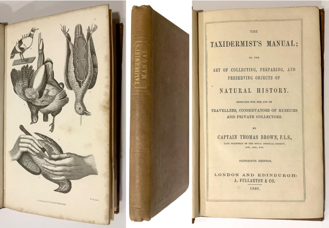 Brown, Captain Thomas. The Taxidermist's Manual; or the art of collecting, preparing, and preserving objects of natural history ; designed for the use of travellers, conservators of museums, and private collectors. Sixteenth edition. xii, 150pp., half-title., 6 engraved plates, small woodcut on the verso of the half-title, and text diagrams. A good copy bound in original blind stamped and gilt lettered cloth. Old cup mark to the rear board, and some marginal foxing to the plates. Although running to many editions it is a scarce work, suggesting that the survival rate of volumes was very low.