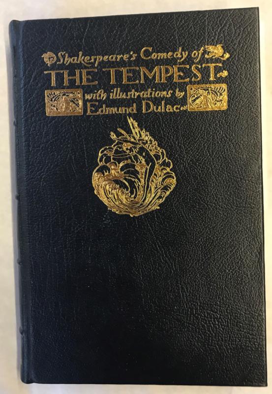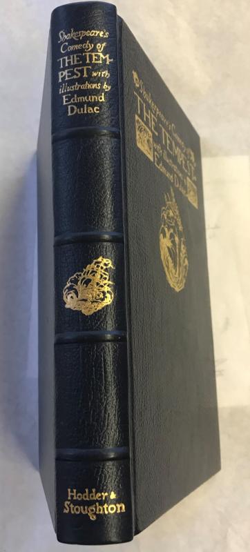 Published by Hodder & Stoughton, London, 1982, unspecified limited edition. Full navy blue leather binding. Four raised bands to spine. Gilt lettering and decoration to spine and front board. AEG. 10.5ins x 7.25ins, blue watered silk endpapers, xxiv, 144pp plus 40 tipped-in , tissue guarded, colour plates by Edmund Dulac. Ribbon marker. Fine