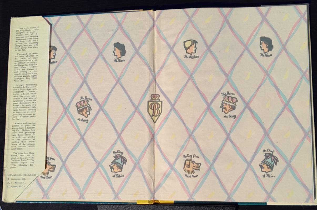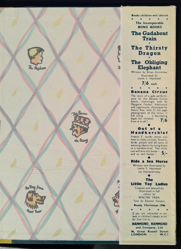 This is the 4th in the series of Bong Books, each one being complete in itself. Decorative pictorial endpapers, colourful pictures throughout with the text, [48 pages]. 285 x 220 mm [approx. 11”x 8 ½”] cloth spine, glossy pictorial boards; light rubbing and some grazing, mainly to the extremities else a very good tight clean copy. The matching pictorial dust jacket is price clipped, has some wear and a few edge-tears repaired internally long ago but is mainly complete and very good. Quite hard to find copies now in their original dust jackets, partly as the jacket is quite thin paper due to the ongoing war-time paper shortages. London Hammond, Hammond & Company, Ltd 1st edition 1945