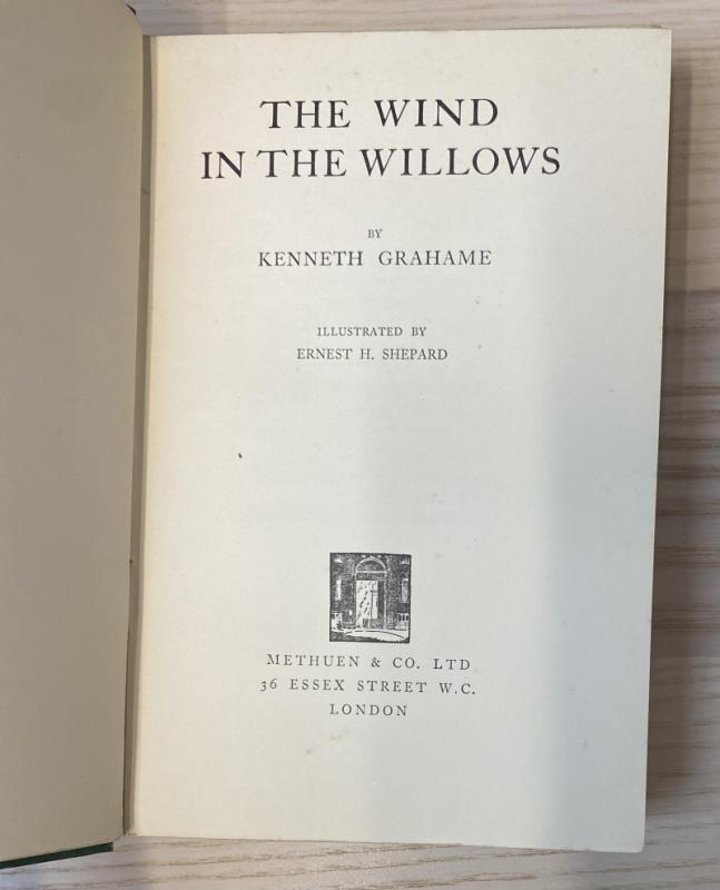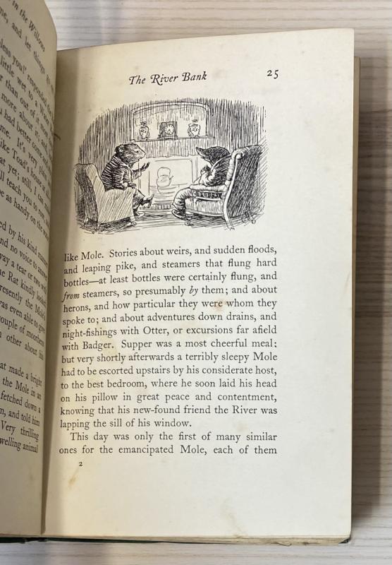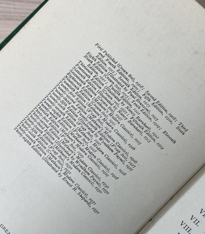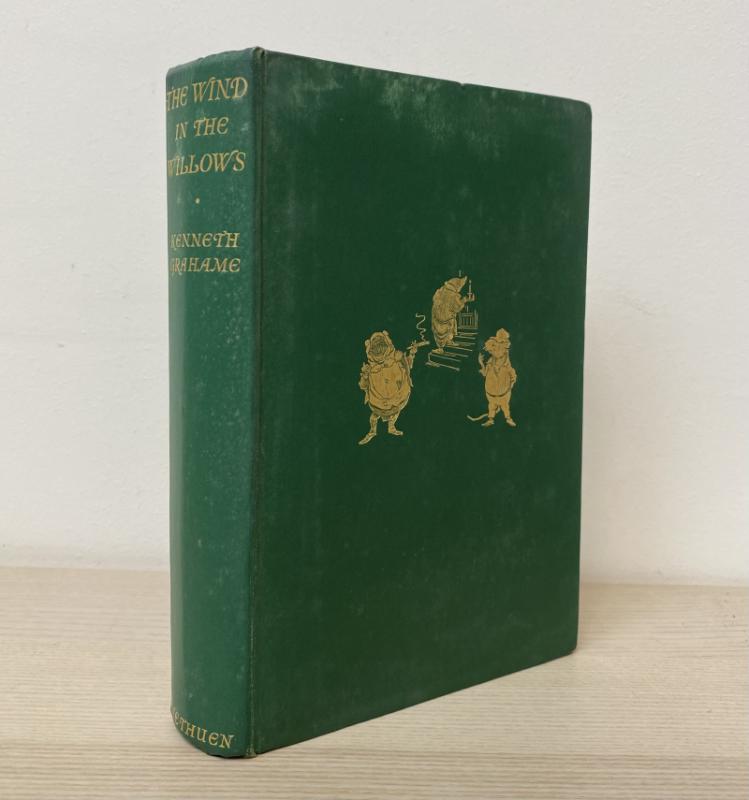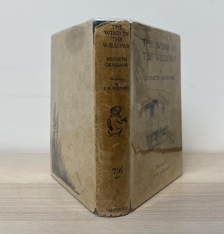 First edition thus with E. H. Shepard illustrations; thirty-eighth impression after the true first. Scarce in a complete wrapper. The wrapper with spine age-toned, with chipping resulting in light loss to the head and tail and the corners. Panels similarly a touch age-toned and scuffed, with some marks and a small spot of water damage affecting caravan on front panel. Inner flaps just a little spotted and toned at upper edge. Publisher's green cloth, gilt pictorial tooled front board, gilt titles to spine. Some slight damp damage and wear to boards and spine, which is cocked; spine ends and extremities a little bumped. Front hinge strained slightly at half title page. Binding a little tender, and some spots throughout. A scarce example of the first edition featuring E. H. Shepard's illustrations with a complete dust wrapper.