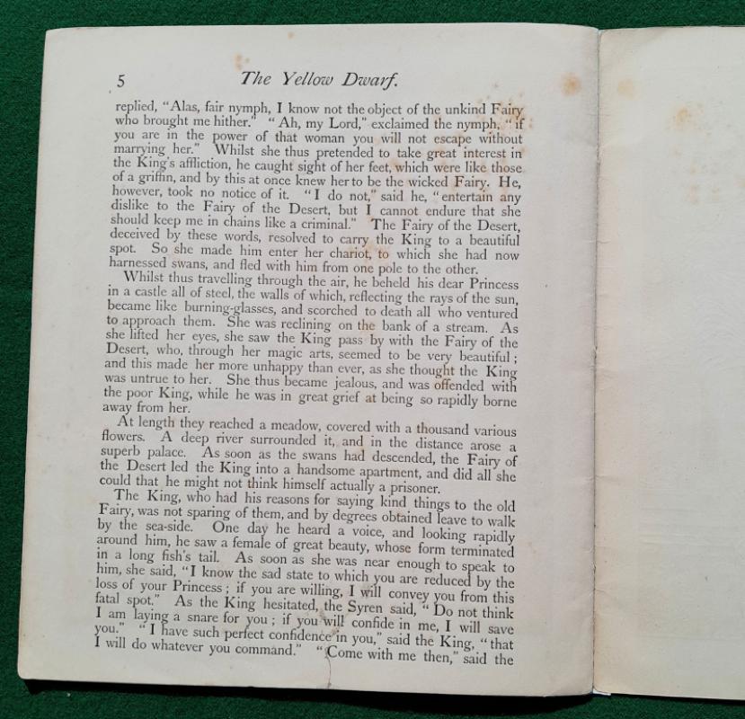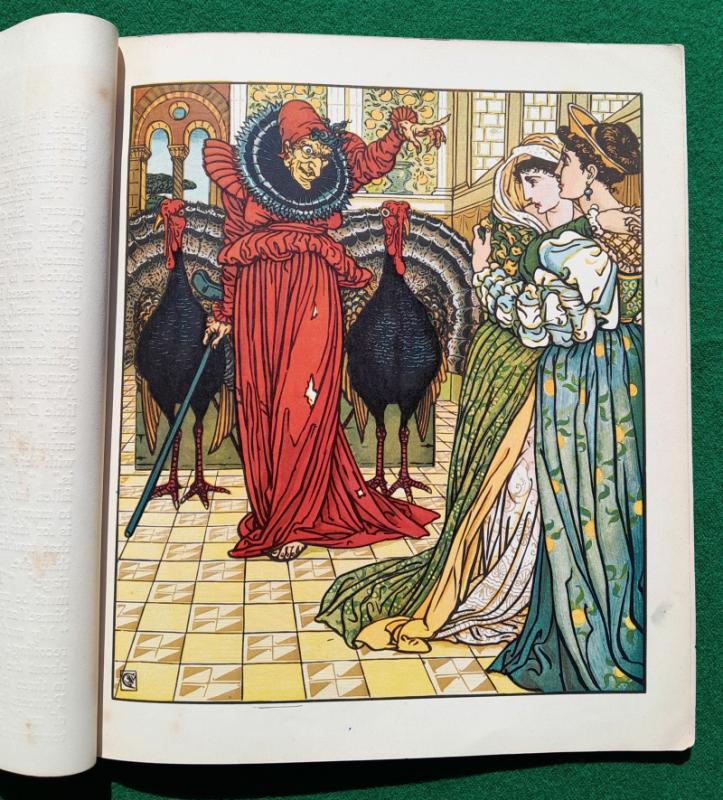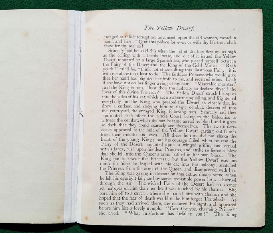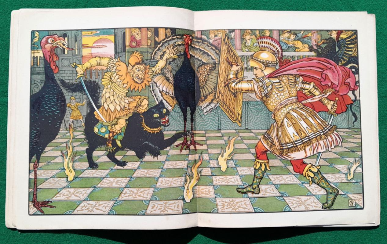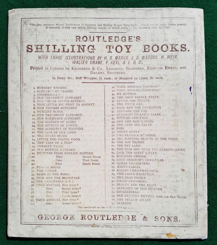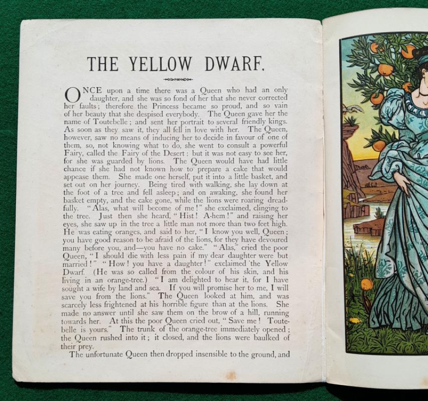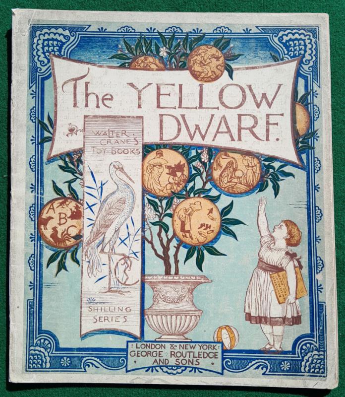 Walter Crane The Yellow Dwarf. [1875] 1st edition. Has 6 large richly coloured plates, the central pair form a striking double-spread picturing a fearsome combat between the Prince and the Yellow Dwarf who is mounted on a fierce black cat. 6 pages of text, the first and last printed on the inside of the covers, one leaf has a short, closed edge tear, some gutters reinforced. Publishers original thin card pictorial wraps with list of Routledge’s Shilling Toy Books on the back; two corner tips chipped, some minor wear, dust-marking mainly to edges. Walter Crane’s Toy Books Shilling Series. London. George Routledge and Sons 1st edition [1875]