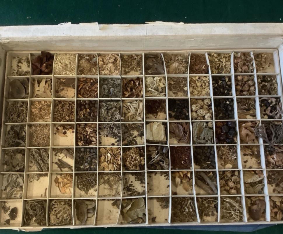 CABINET of Natural Curiosities. 19th Century. Marbled paper covered box with three trays containing c220 samples of spices, plant seeds, leaves, barks, resins and other natural products collected from around the world - Americas, Africa Asia &c.