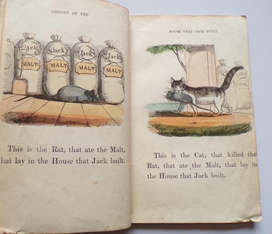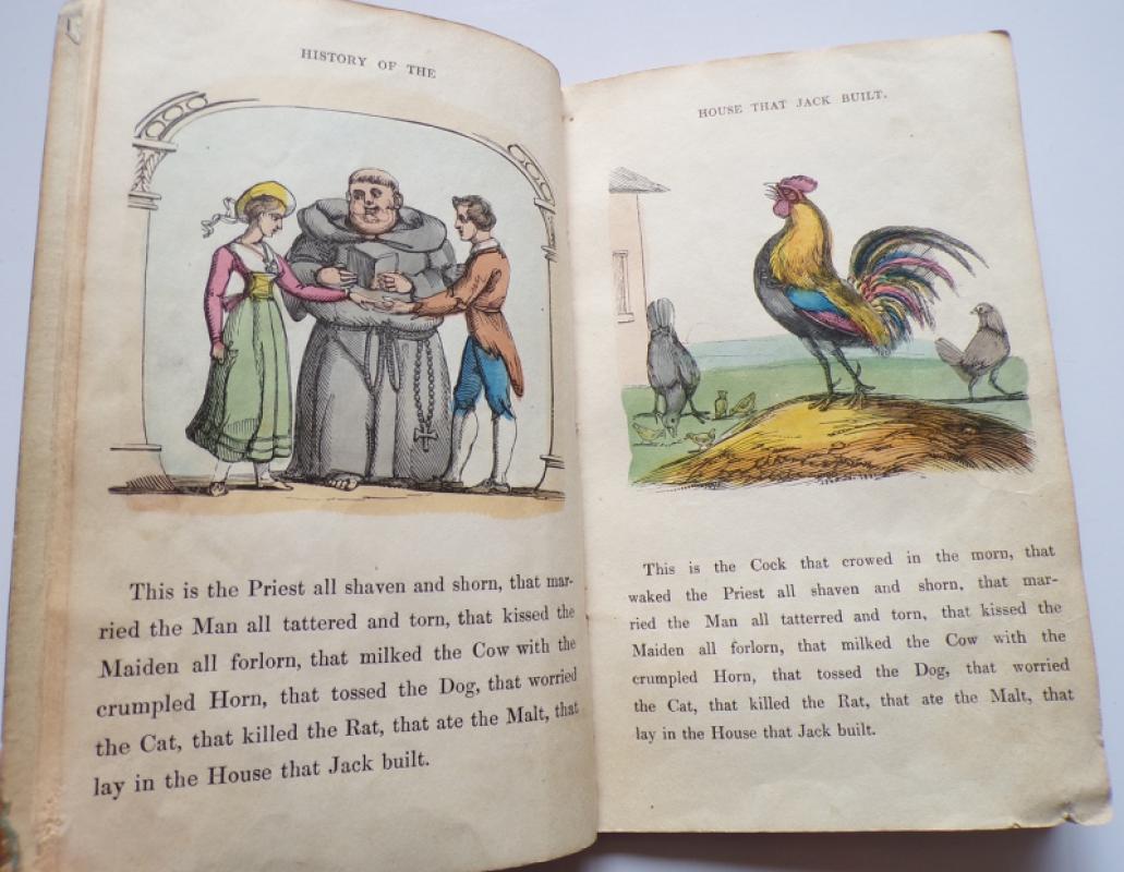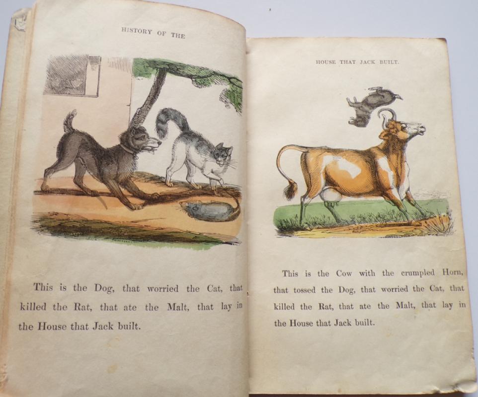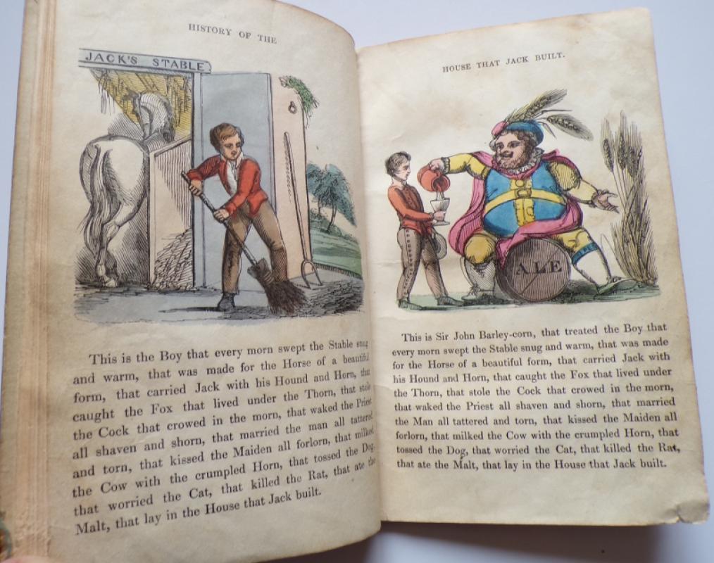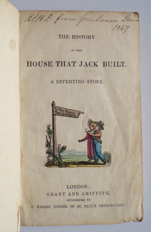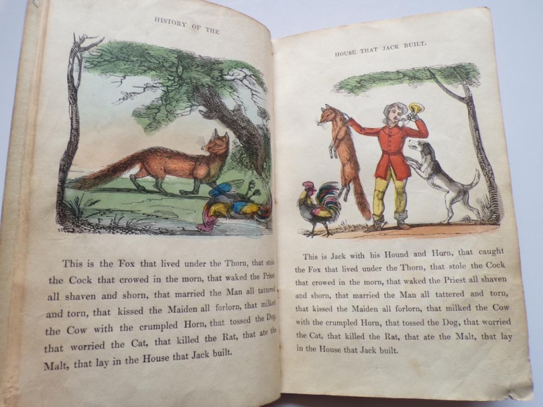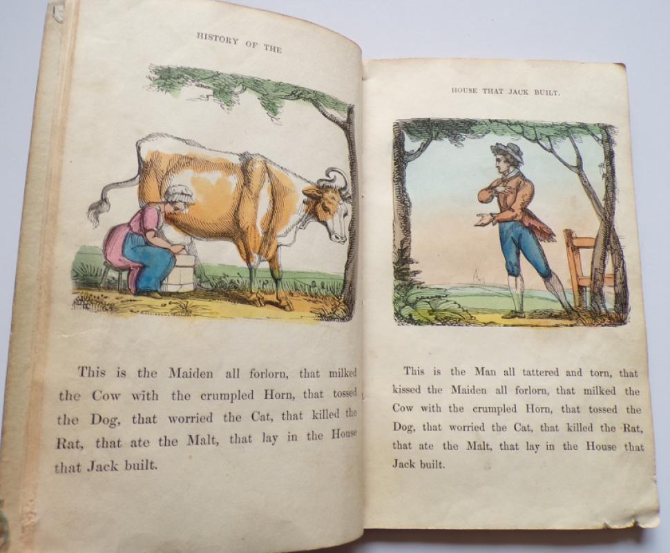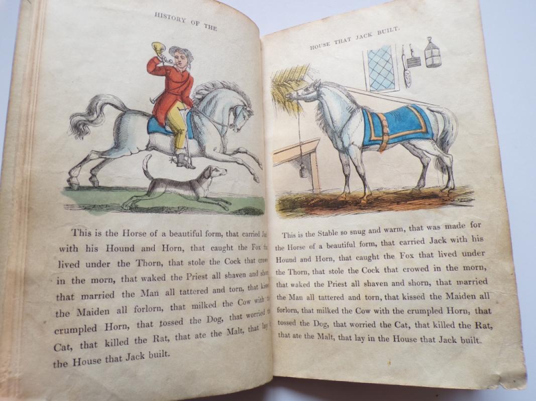 The first work is The History of the House that Jack Built, bound without the original covers, and opens onto the title page, all pages printed on one side only, with original hand colouring to the illustrations, pages not numbered, but all pages of this publication are pictured