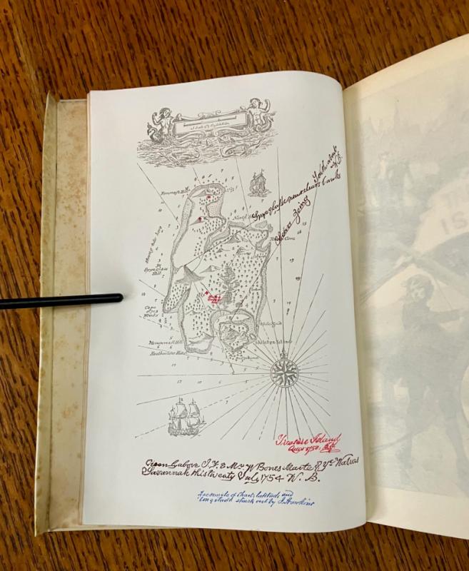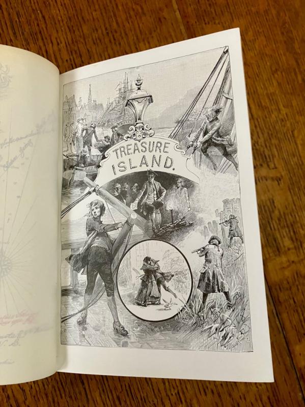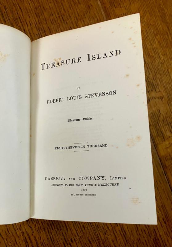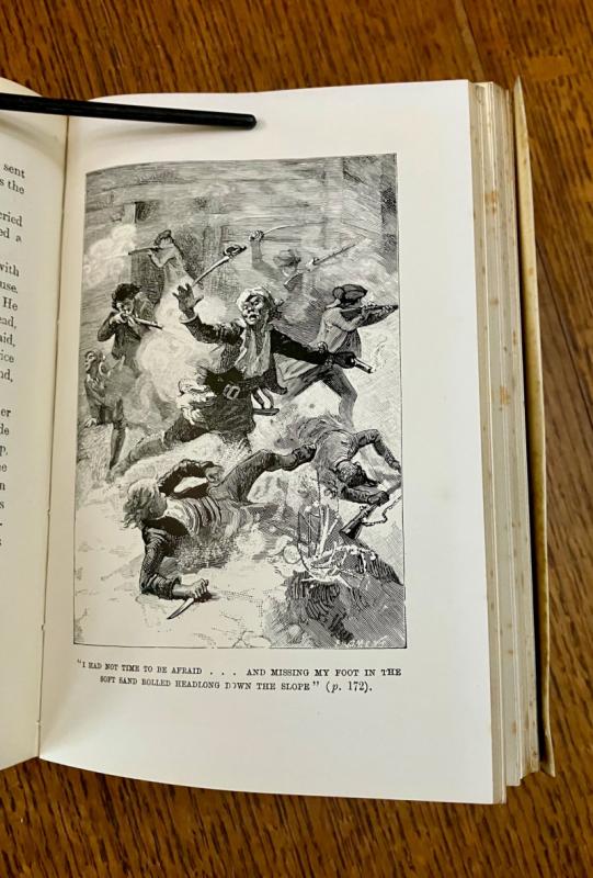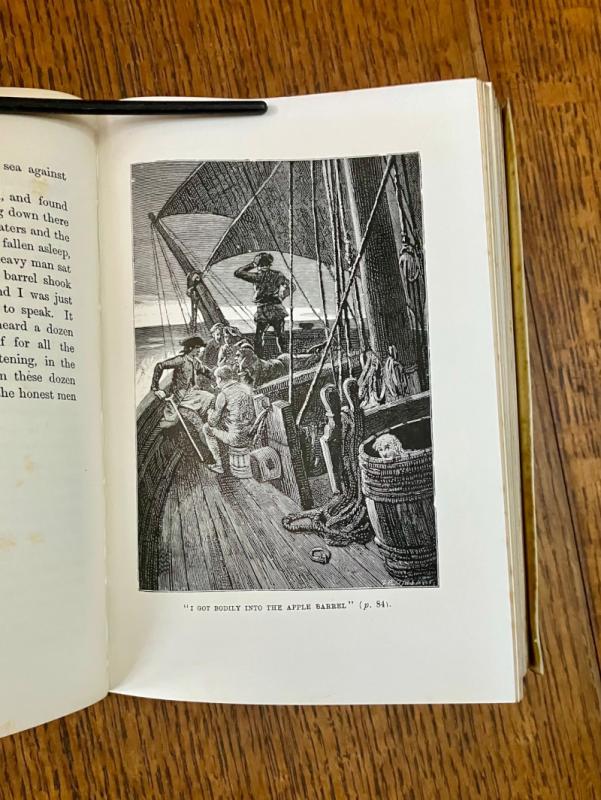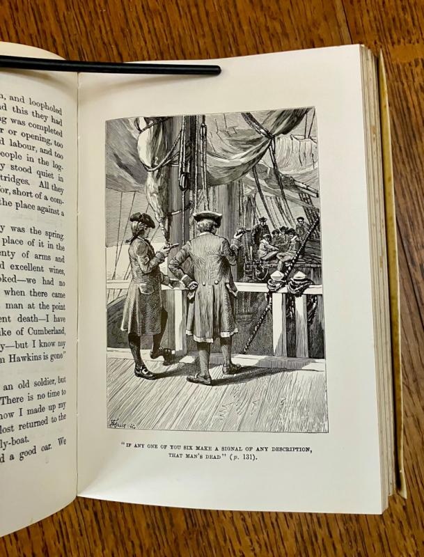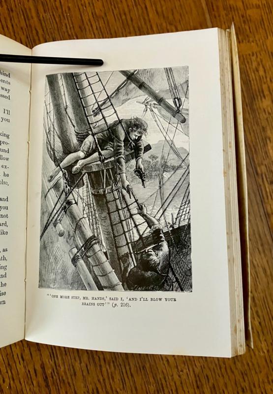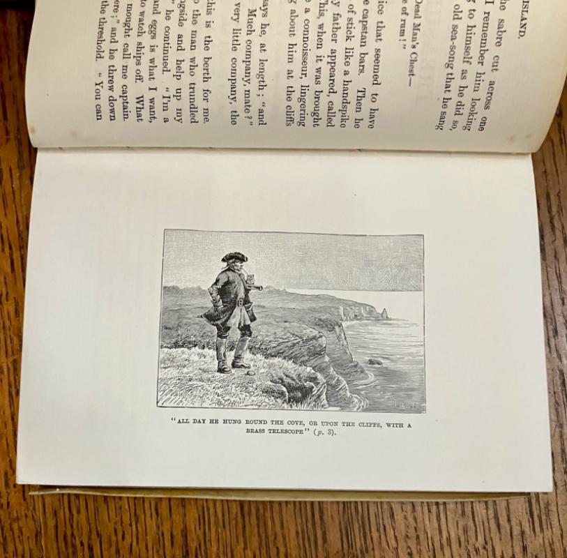 Reprint of the 1885 first illustrated edition. Eighty-Seventh thousand. 8vo.(7.3 x 5 inches). viii, 292 pp. Illustrated with a frontispiece map, with tissue guard, illustrated second title page, and 24 full page mono plates by various French artists, including F. J. Merril, T. Moller, J. Ladmiral, and others, although none are credited, aside from their signatures on some of the illustrations. First and last few pages, plus a few scattered leaves throughout and the blank endpapers are foxed. some loss to the bottom of the page in the margin of the last two text leaves and two blank endpapers, very slightly affecting the copyright notice at the foot of the final page. Neat four line inscription, dated 1900, on a front blank free endaper. Contemporary full vellum binding with yapp fore edges. Spine ruled and lettered in gilt. All edges gilt.Some toning to the vellum but overall a very good copy in a plain, but attractive binding. --- Prideaux, Bibliography of the works of Robert Louis Stevenson, No. 11, note on page 29 listing the first printing of this edition in 1885.