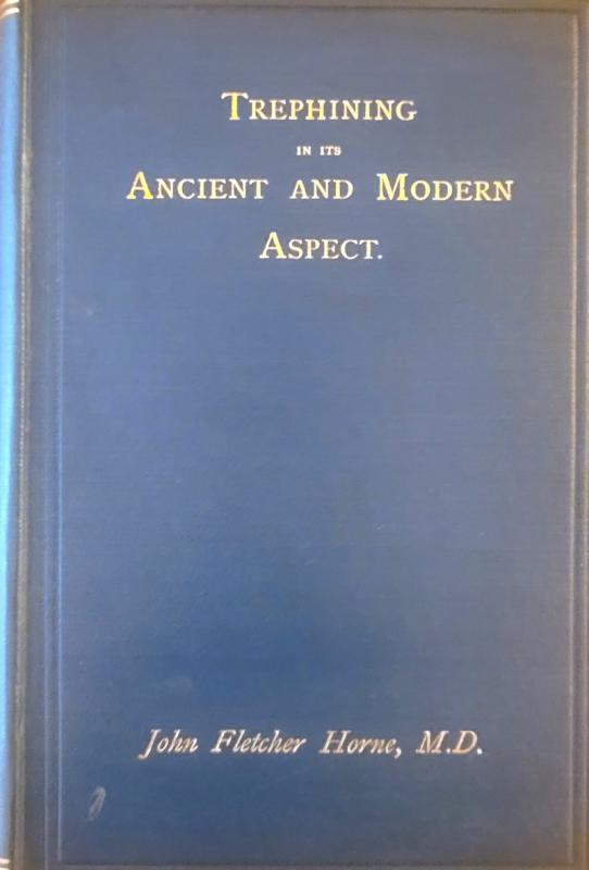 Trephining in its Ancient and Modern Aspect, by John Fletcher Horne, pub. John Bale & sons, 1894, first (only) edition. 133 pp. Illustrated. Blue cloth, gilt titles. Tidy ownership inscription 'R McIntosh' (the doctor father of Kinn McIntosh, better known as 'Catherine Aird', the crime fiction author).