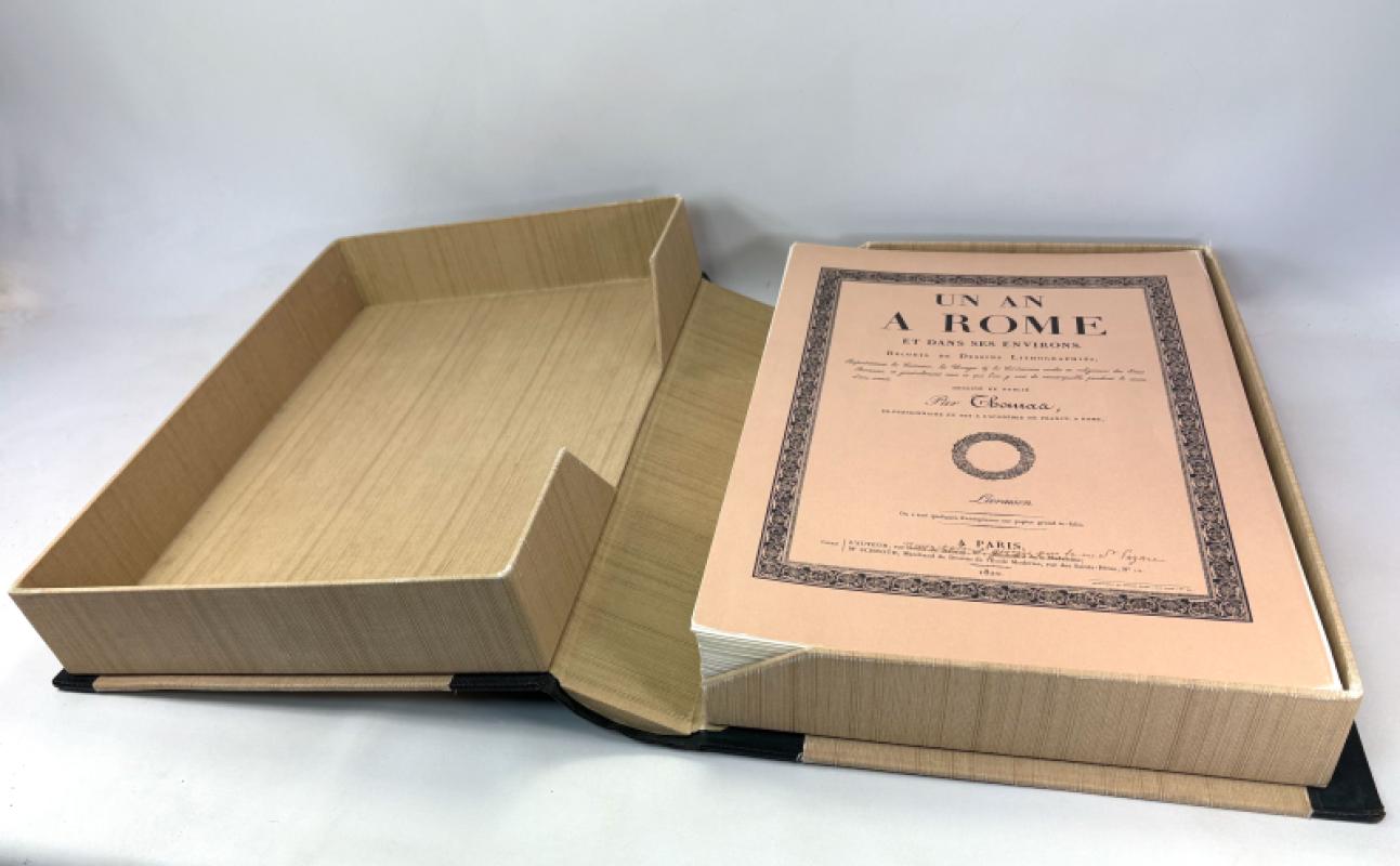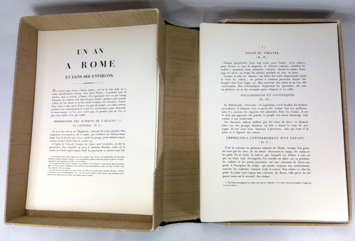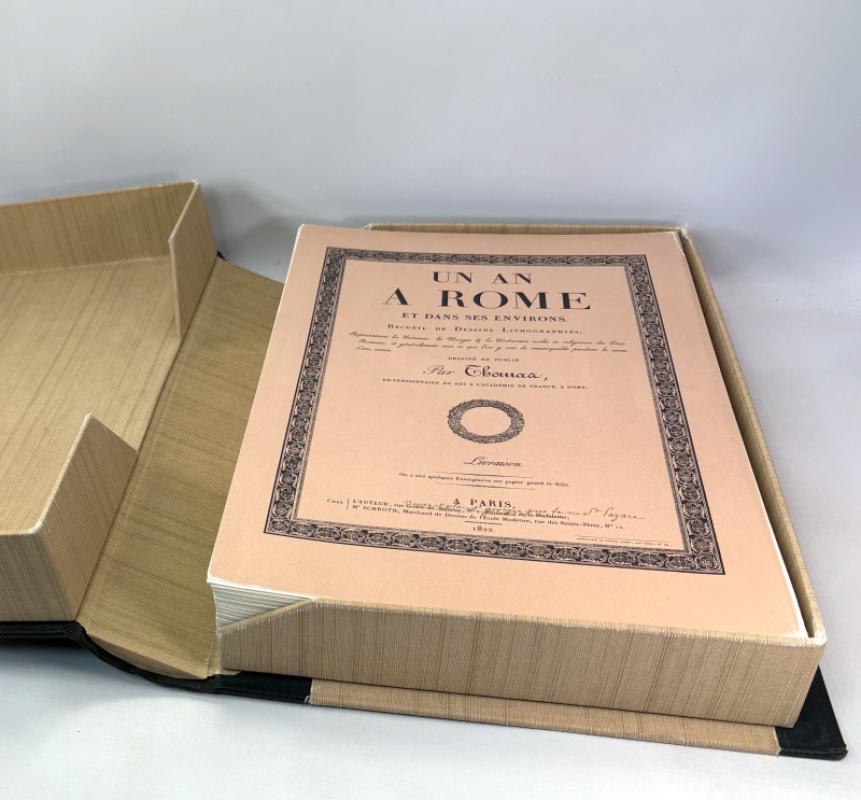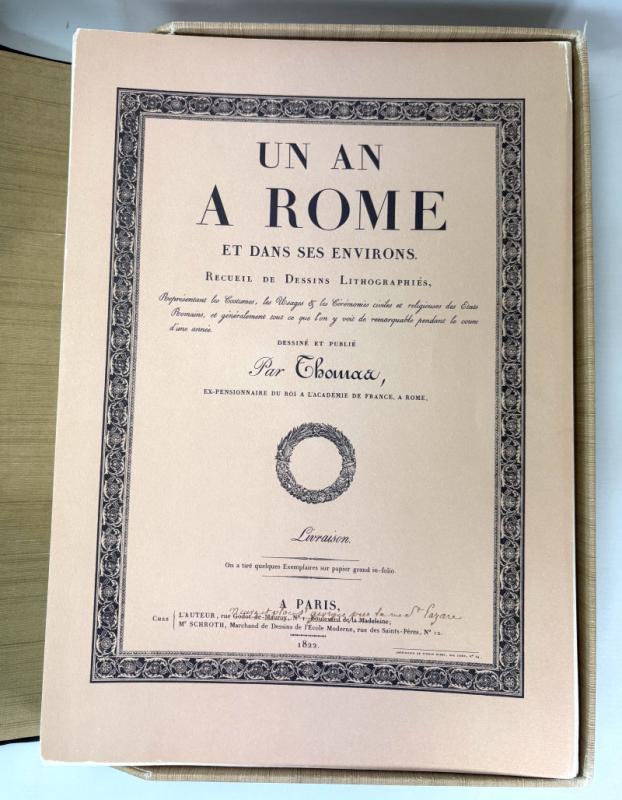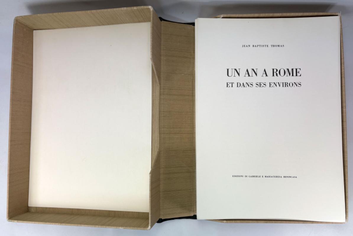 A deluxe limited folio facsimile of Antoine-Jean-Baptiste Thomas's celebrated Un an à Rome et dans ses environs, issued in Rome in 1972 by Gabriele and Mariateresa Benincasa. This numbered copy (No. 383) is complete with the full suite of plates in both states - 72 colour and 72 monochrome - together with 44 pages of text, each plate protected by its original ajoining tissue guard and housed in the publisher's half-leather Solander case. A superbly produced and increasingly sought-after modern facsimile of an important early nineteenth-century Roman work.