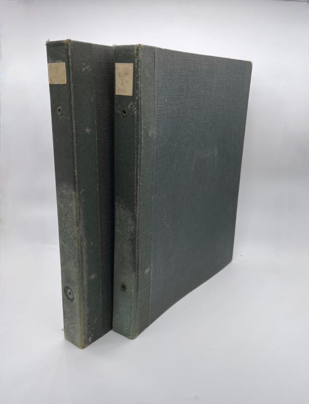 Two contemporary ring binders (Vols. I & III?, possibly of V?) containing typescript carbon copies. Two green buckram ring binders (‘Walker’s “Kenbury” Ring Book, no. 1108’; 28.5 x 24.3cm), white paper title labels to spines (“Vol I. Legs,” the second faded), containing cream paper (Croxley Titan Bond watermark; 26.8 x 20.9cm), secured by rusty metal ring clips; mimeographed black type on one-side only, pp. 1-108: Section 1, Chapters 1-5; pp. 193-296 (duplicate of p.210 laid in): Section 3, Chapters 12-13; Section 4, Chapters 14; & Section 5. Chapters 15-17). Rubbed and uneven fading, bruised and worn at extremities, some marks. Metal ring clips rusty. A few pages, including title page loose, others reinforced by clear tape, some minor nicking, creasing and foxing, very occasional annotations by hand in blue ink to Vol. III. Else, typescripts clean and bright. Good+