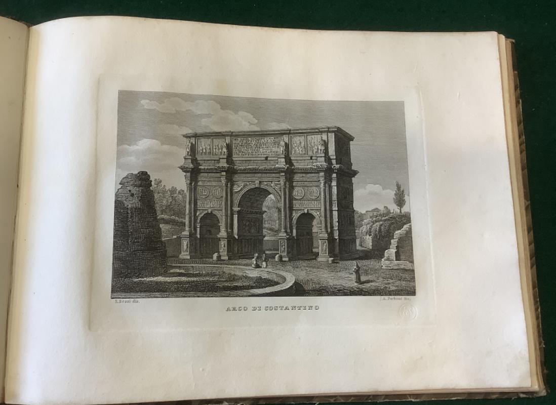PARBONI, Achille. Nuova Raccolta Delle Principali Vedute Antiche e Moderne della Citta di Roma e sue Vicinanze disegnate dale vero dal professore Silvestro Bossie ed incise in rame da Achille Parboni. Engraved title-page, and 34 unnumbered engraved plates. Contemporary straight grain half morocco, gilt decorated spine, marbled boards. Some wear to the surface paper on the boards and light rubbing to the extremities. The plates are clean and have a faint old waterstain just visible on the lower margin of some pages.