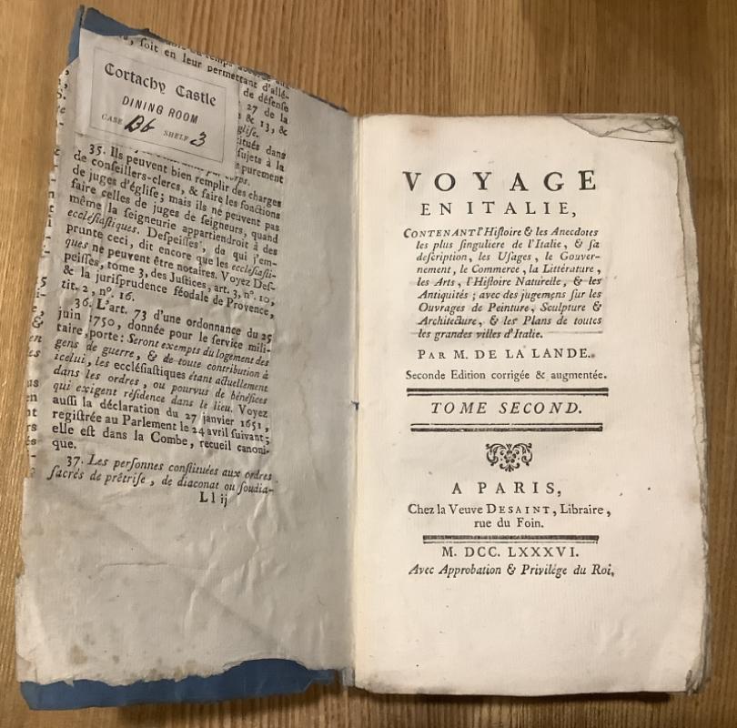 With the library label of ‘Cortachy Castle, Dining Room’. Possibly acquired three years before the French Revolution when a family member visited France, possibly on the Grand Tour.