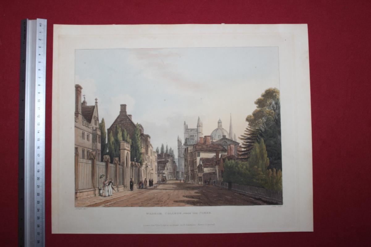 Aquatint print with a view of Wadham College. The paper is lightly browned. There are some old tape remains to the upper edge at the rear where it has been mounted in the past. The sheet measures approximately 27 x 33cm.