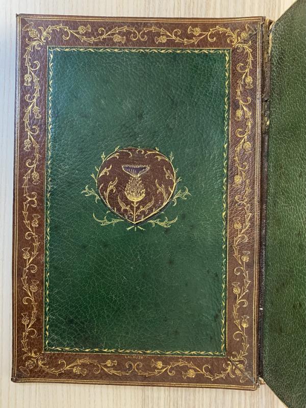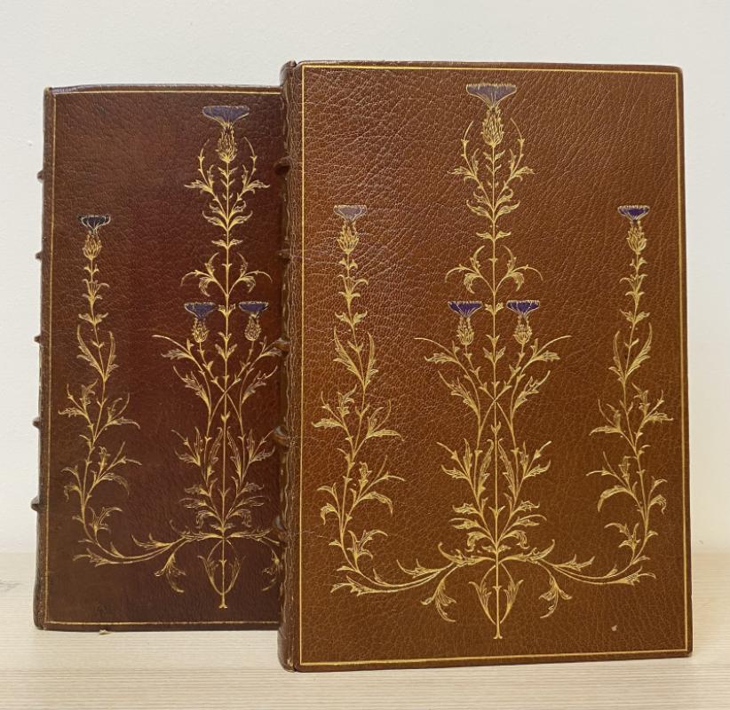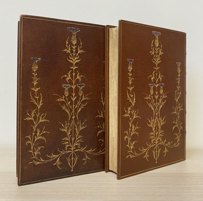 Two volumes, one of a limited edition of twenty-six. Finely bound by Lalauze. Full tan morocco, gilt tooled thistles to boards, gilt decorative spines and borders. Upper edges gilt, gilt dentelles. A few minor spots to spine of Volume I, head of the spine just a touch rubbed, extremities are lightly bumped resulting in slight rubbing. Some very light fading to boards. Signature leather endpapers with similar intricate thistle motif to pastedowns, signed in gilt. Bindings remain tight, bar just light strains at hinges owing to the weight of the boards. Pages are very bright and clean. A truly splendid example of Lalauze bindings.