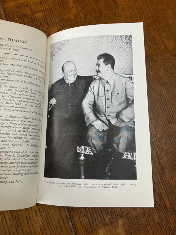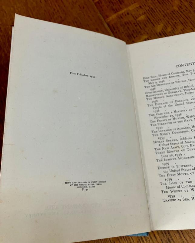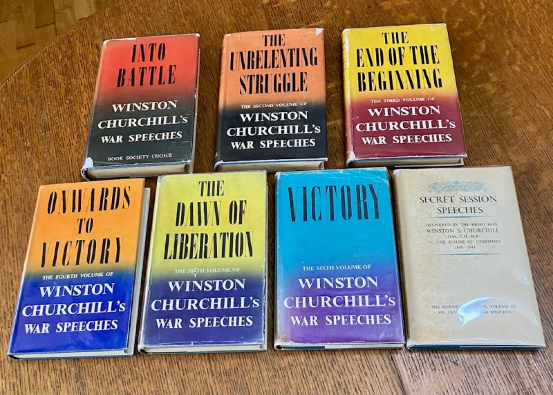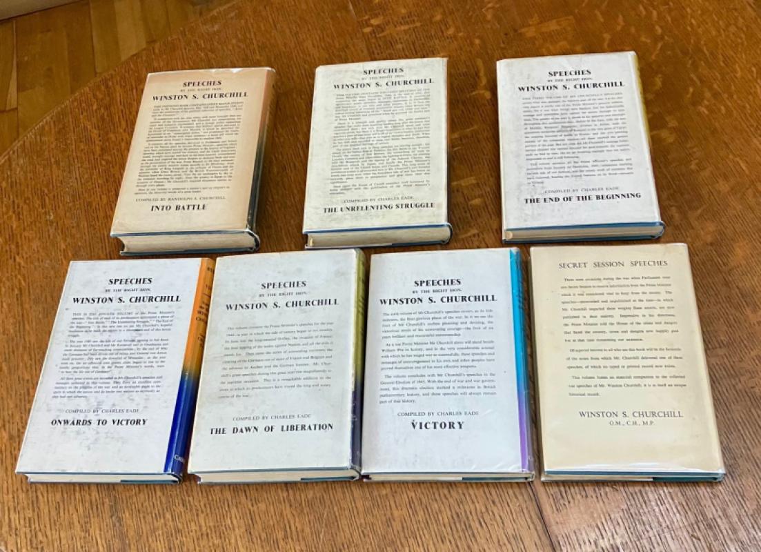 FIRST EDITIONS. 1st impressions, second state of Into Battle (page number on page 78). -- 7 VOLUMES. 8vo. (8.7 x 5.7 inches). Portrait frontispieces in first two volumes but there are several mono photos in each of the last five volumes. Complete set of the war speeches. Overall a very good set in the original publishers different coloured dustwrappers. One volume with an attractive woodcut bookplate, and two of the volumes have a neat contemporary previous owner names or inscriptions to the blank endpapers. Some foxing to the fore edge of four of the volumes and the first few leaves of volume 7, but otherwise all the volumes are generally clean and bright throughout. The wrappers are on the whole in very good condition with some rubbing, chipping and minor loss to the extremities. Overall a near very good example of this important set. --- Complete sets of first editions in nice condition are becoming increasingly difficult to find.