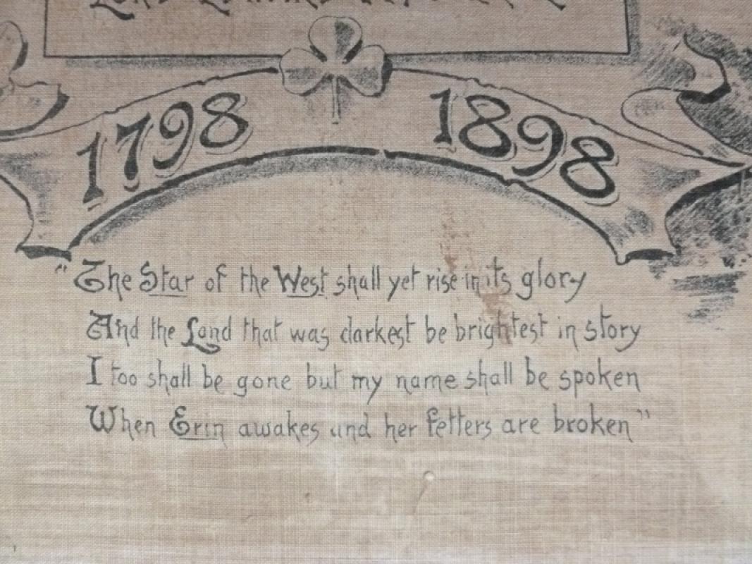 Featured on the handkerchief are the title: "Centenary '98", the motto "Who fears to speak of 98?" and four lines of the ballad The Memory Of The Dead (1843) by John Kells Ingram(1823-1907). With views of New Ross, Wexford, Enniscorthy, and the old Irish Houses of Parliament together with cameo portraits of Lord Edward Fitzgerald, Daniel O’Connell, Robert Emmet, Theobald Wolfe Tone & Henry Joy McCracken and the statue of Grattan.