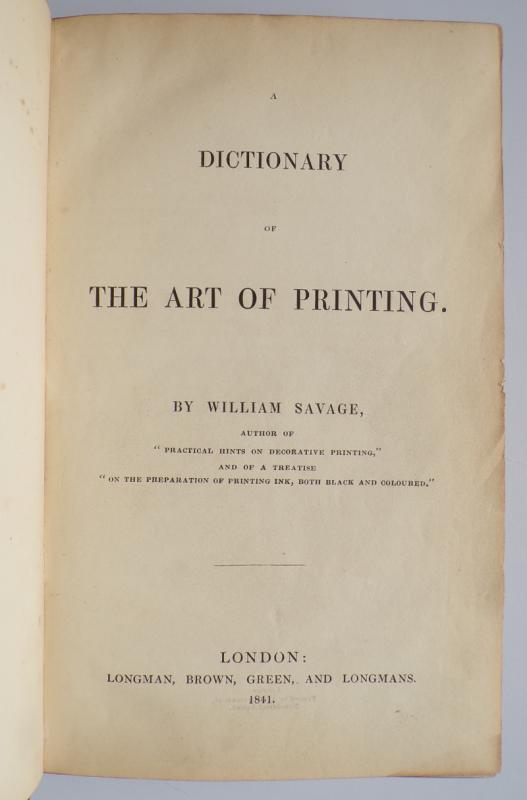 Published in 1841, this is the First Edition of this highly regarded Dictionary of the Art of Printing, covering all aspects of the printing trade across its 815 pages, this example is nicely bound in an old half red leather binding, 9 inches tall approx..