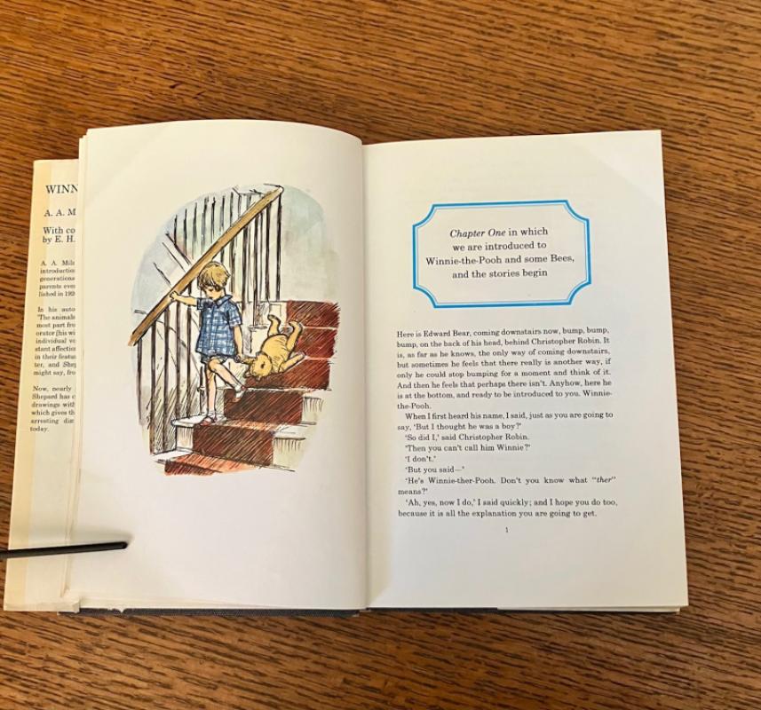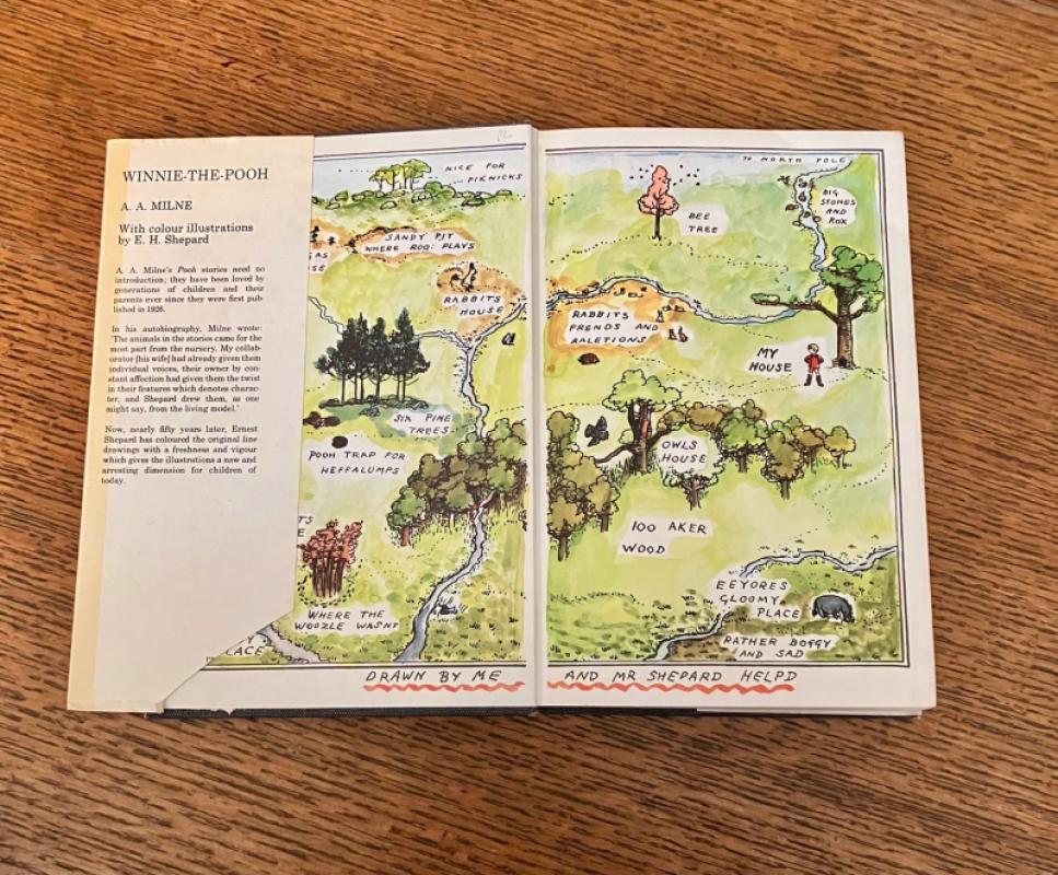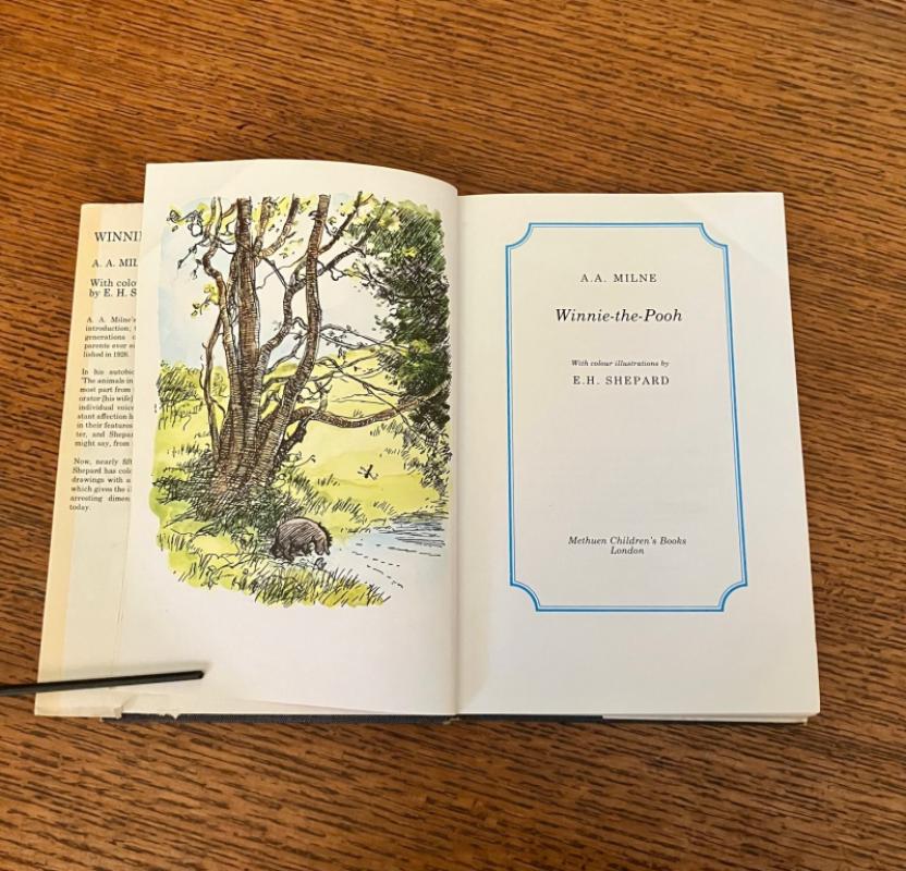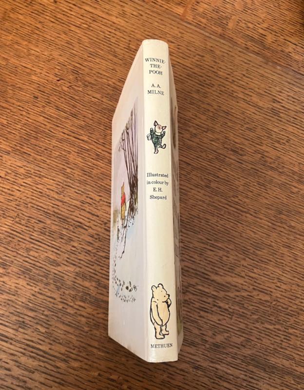 FIRST COLOUR EDITION. First impression. Large 8vo (9.5 x 6.4 inches). Originally published in 1926, uncoloured, Shepard coloured his own line illustrations for this edition. A minor crease to the top of the first 30 pages, otherwise a bright clean copy in publishers blue cloth with gilt stamped illustration of Winnie the Pooh and Christopher Robin on front board. Spine lettered in gilt. Some bumps to the corners and the spine, otherwise a lovely copy. In the original very good dustwrapper which is price clipped to the inner front flap and has toned a little over the years but is still bright, and has some rubbing to the edges. Colour map endpapers. Overall a nice clean copy of this classic. Uncommon in this 1973 first printing.