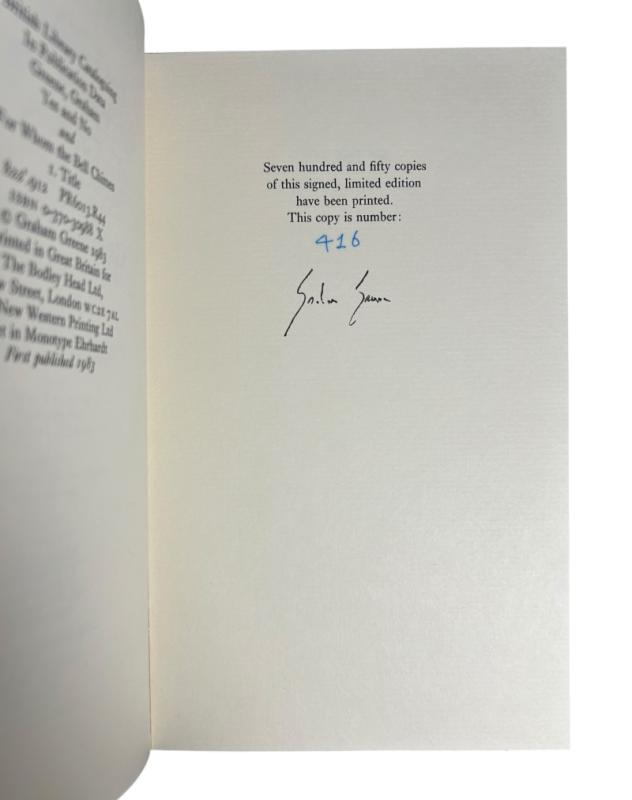 London: The Bodley Head, 1983. This is a very near fine copy. One of seven hundred and fifty copies. Original glassine is without wear. Bound in the original publishers olive-green cloth. The gilt lettering is so slightly marked, but bright and vibrant. There is a vague smattering of foxing to the top edge. Greene’s signature is present on the colophon in black ink. This copy is no. 416 of 750. There are no additional marks to note. Overall, this is very near fine copy.